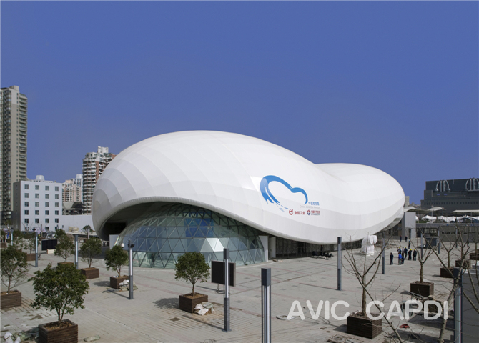 The design concept is inspired by the shape of cloud in the sky also incorporates the shape of aircraft. The external face of the whole building is covered by white colored PVC membrane material supported by space frame supporting systems. The pavilion is with length of 72m width of 48m.
