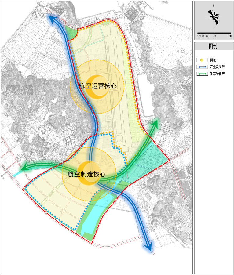 總體布局:該片區(qū)總體上形成“兩核兩帶”的規(guī)劃結構。兩核為航空運營核心和航空制造核心,兩帶為產業(yè)發(fā)展帶和生態(tài)綠帶。